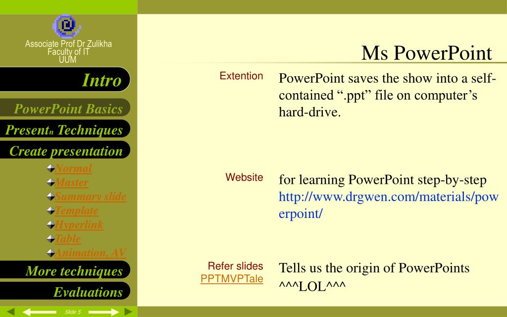 Ms PowerPoint Extention Website Refer slides PPTMVPTale PowerPoint saves the show into a self-contained “.ppt” file on computer’s hard-drive. for learning PowerPoint step-by-step http://www.drgwen.com/materials/powerpoint/ Tells us the origin of PowerPoints ^^^LOL^^^