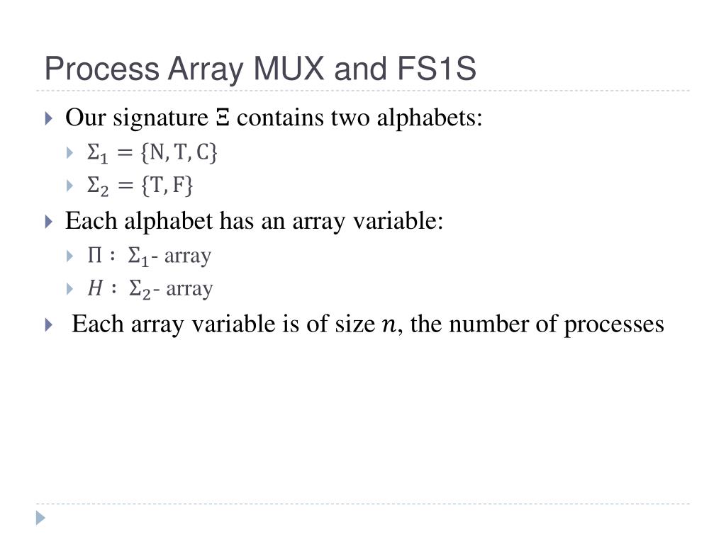 Process Array MUX and FS1S • Our signature contains two alphabets: • Each alphabet has an array variable: • - array • - array • Each array variable is of size , the number of processes