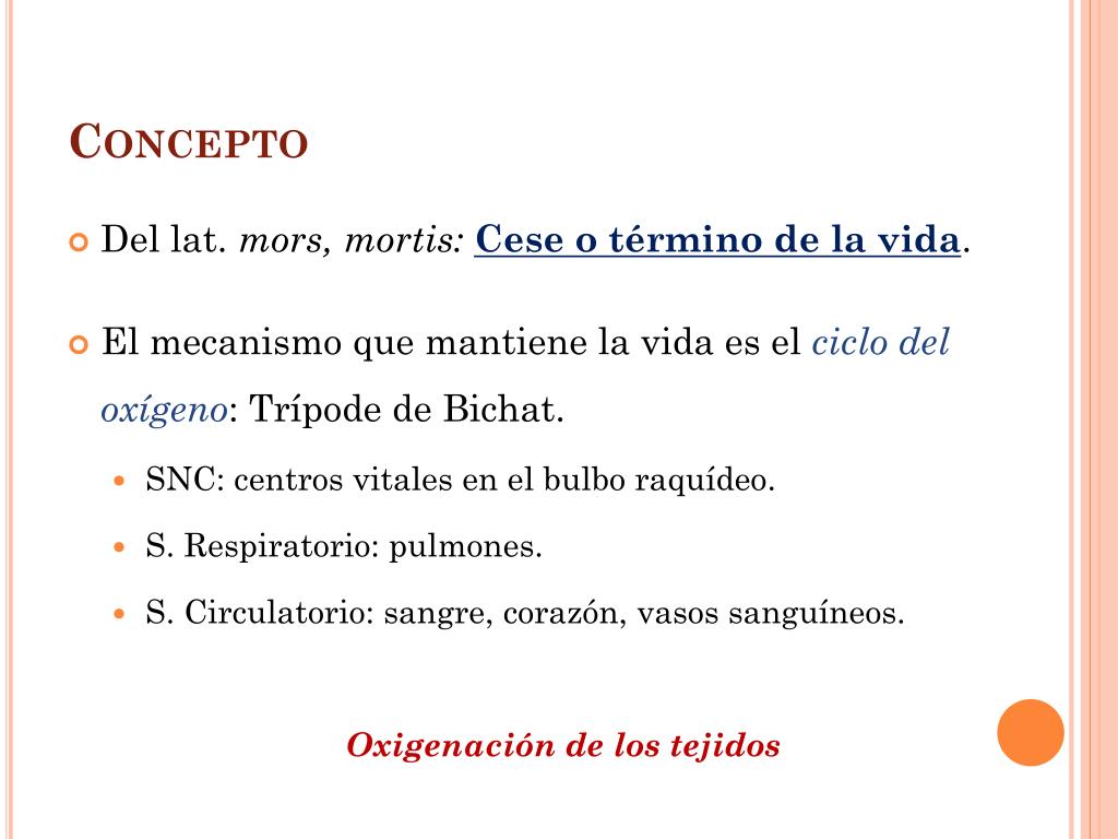 Concepto • Del lat. mors, mortis: Cese o término de la vida. • El mecanismo que mantiene la vida es el ciclo del oxígeno: Trípode de Bichat. • SNC: centros vitales en el bulbo raquídeo. • S. Respiratorio: pulmones. • S. Circulatorio: sangre, corazón, vasos sanguíneos. Oxigenación de los tejidos