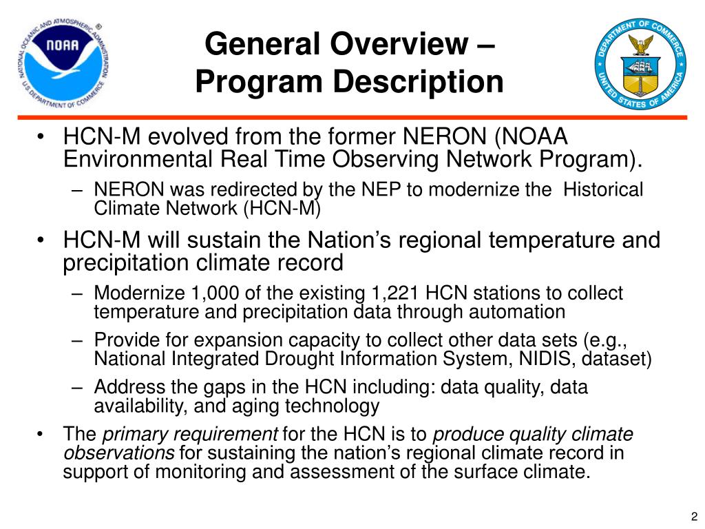 Status of NERON/HCN-M for The Committee for Climate Analysis, Monitoring, and Services (CCAMS). John Hahn NWS Office of Science and Technology. General Overview – Program Description. HCN-M evolved from the former NERON (NOAA Environmental Real Time Observing Network Program).