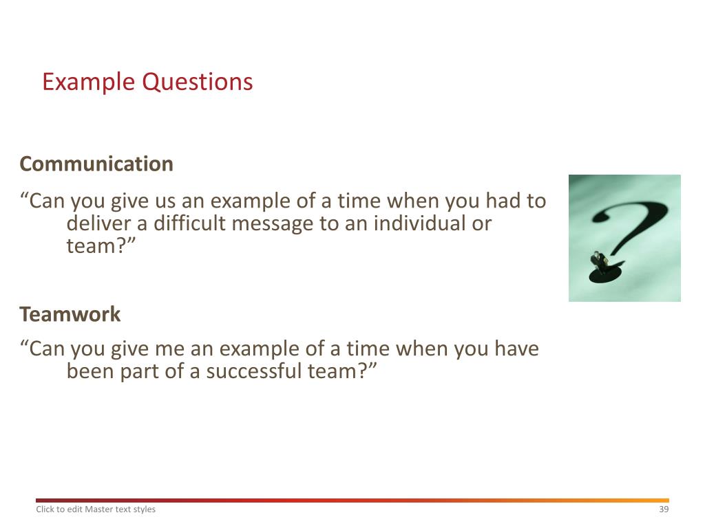 Example Questions Communication “Can you give us an example of a time when you had to deliver a difficult message to an individual or team?” Teamwork “Can you give me an example of a time when you have been part of a successful team?”