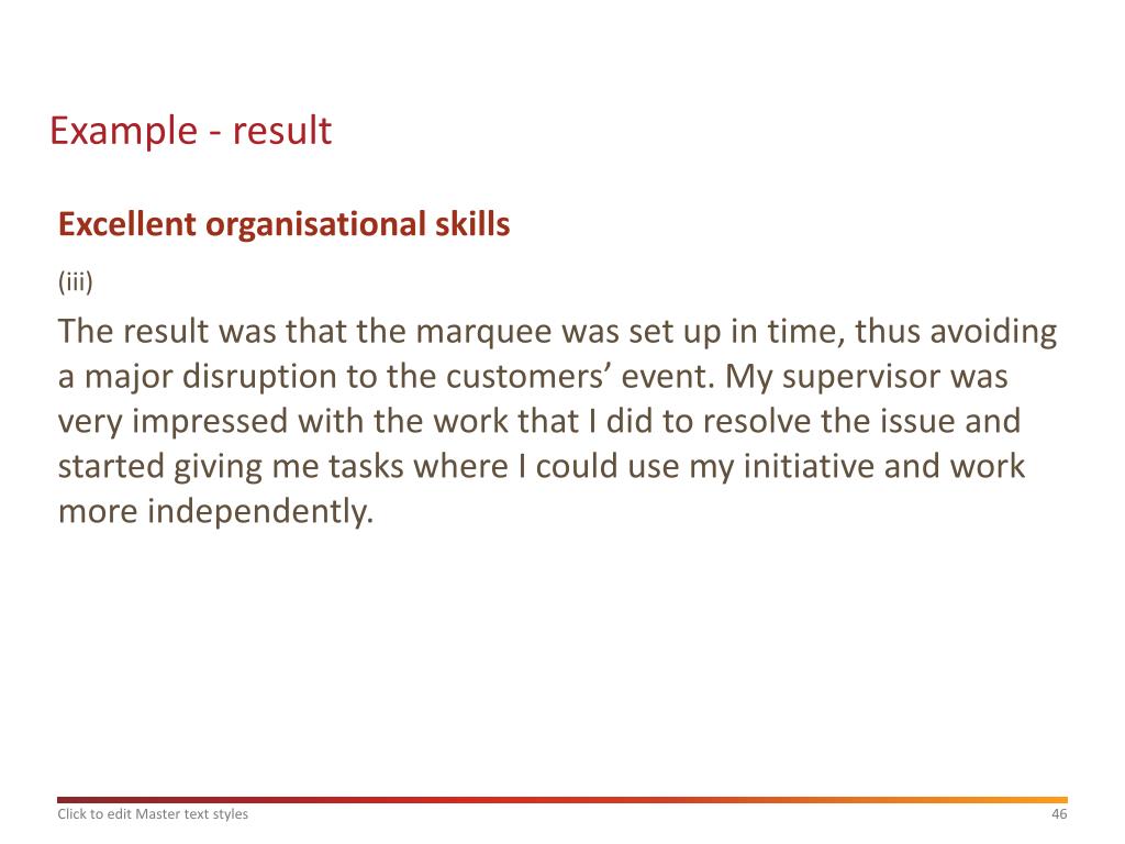 Example - result Excellent organisational skills (iii) The result was that the marquee was set up in time, thus avoiding a major disruption to the customers’ event. My supervisor was very impressed with the work that I did to resolve the issue and started giving me tasks where I could use my initiative and work more independently.