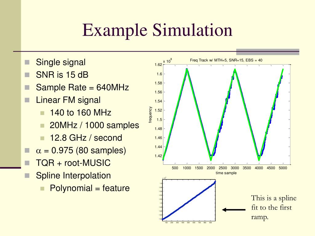 Example Simulation • Single signal • SNR is 15 dB • Sample Rate = 640MHz • Linear FM signal • 140 to 160 MHz • 20MHz / 1000 samples • 12.8 GHz / second • a = 0.975 (80 samples) • TQR + root-MUSIC • Spline Interpolation • Polynomial = feature This is a spline fit to the first ramp.