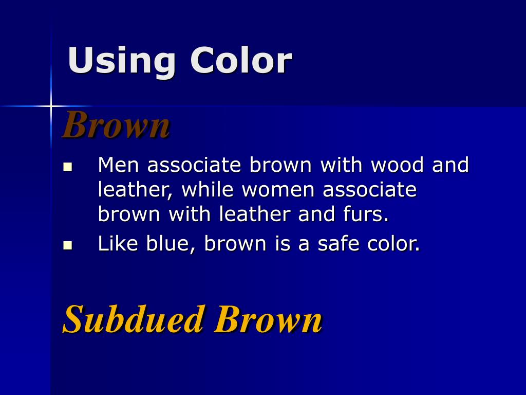 Using Color Brown • Men associate brown with wood and leather, while women associate brown with leather and furs. • Like blue, brown is a safe color. Subdued Brown