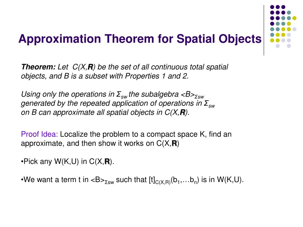 Approximation Theorem for Spatial Objects Theorem: Let C(X,R) be the set of all continuous total spatial objects, and B is a subset with Properties 1 and 2. Using only the operations in Σsw the subalgebra <B>Σsw generated by the repeated application of operations in Σsw on B can approximate all spatial objects in C(X,R). • Proof Idea: Localize the problem to a compact space K, find an approximate, and then show it works on C(X,R) • Pick any W(K,U) in C(X,R). • We want a term t in <B>Σsw such that [t]C(X,R)(b1,…bn) is in W(K,U).