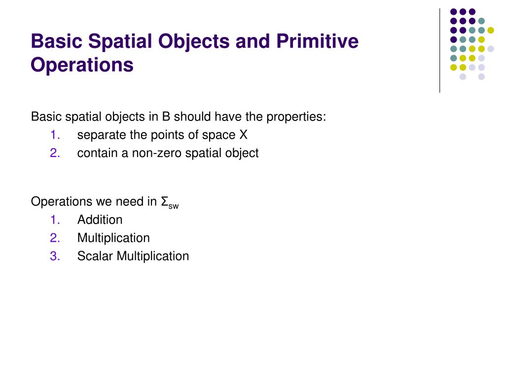 Basic Spatial Objects and Primitive Operations Basic spatial objects in B should have the properties: • separate the points of space X • contain a non-zero spatial object Operations we need in Σsw • Addition • Multiplication • Scalar Multiplication