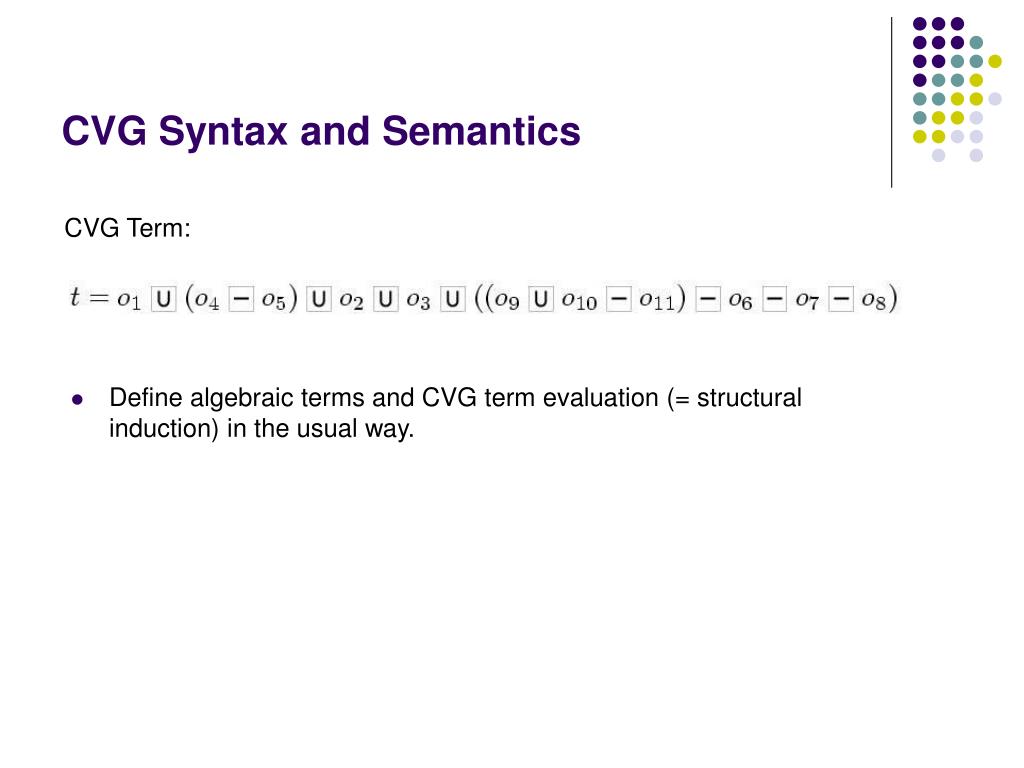 CVG Syntax and Semantics • Define algebraic terms and CVG term evaluation (= structural induction) in the usual way. CVG Term: