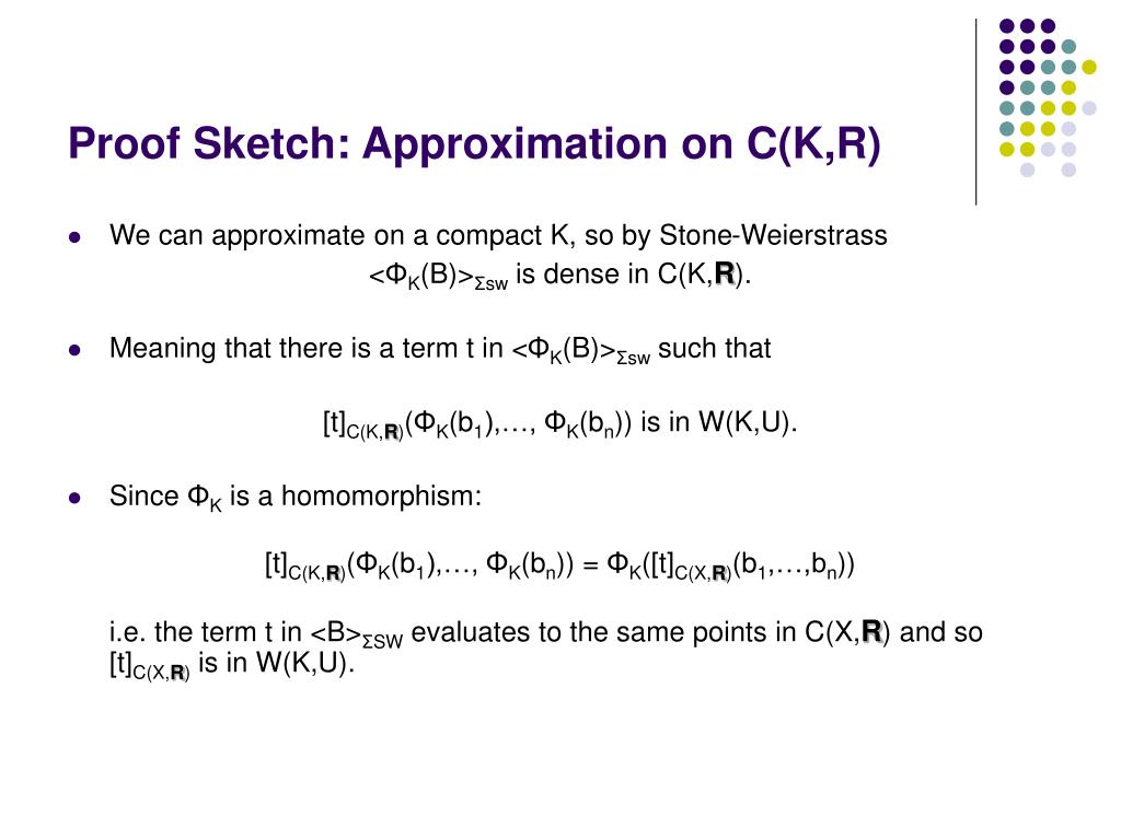 Proof Sketch: Approximation on C(K,R) • We can approximate on a compact K, so by Stone-Weierstrass <ΦK(B)>Σsw is dense in C(K,R). • Meaning that there is a term t in <ΦK(B)>Σsw such that [t]C(K,R)(ΦK(b1),…, ΦK(bn)) is in W(K,U). • Since ΦK is a homomorphism: [t]C(K,R)(ΦK(b1),…, ΦK(bn)) = ΦK([t]C(X,R)(b1,…,bn)) i.e. the term t in <B>ΣSW evaluates to the same points in C(X,R) and so [t]C(X,R) is in W(K,U).