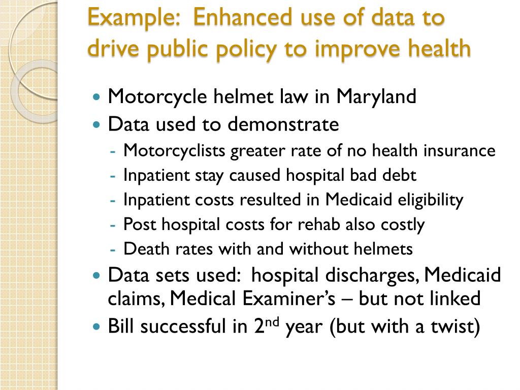 Example: Enhanced use of data to drive public policy to improve health • Motorcycle helmet law in Maryland • Data used to demonstrate • Motorcyclists greater rate of no health insurance • Inpatient stay caused hospital bad debt • Inpatient costs resulted in Medicaid eligibility • Post hospital costs for rehab also costly • Death rates with and without helmets • Data sets used: hospital discharges, Medicaid claims, Medical Examiner’s – but not linked • Bill successful in 2nd year (but with a twist)
