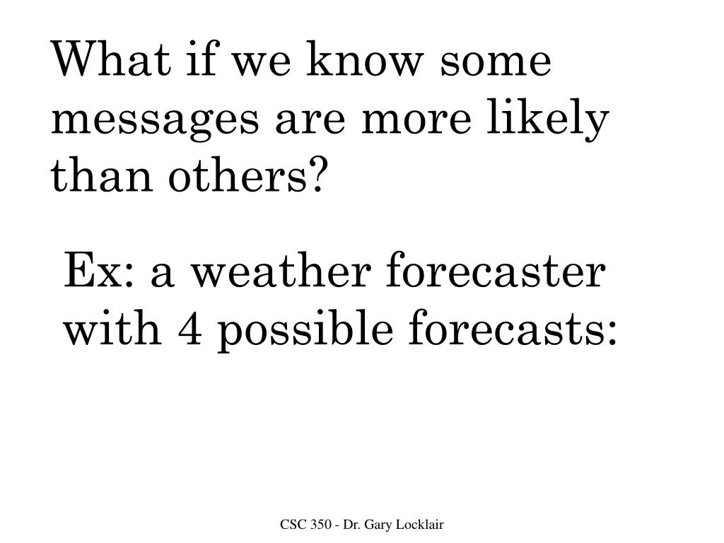 What if we know some messages are more likely than others? Ex: a weather forecaster with 4 possible forecasts: CSC 350 - Dr. Gary Locklair