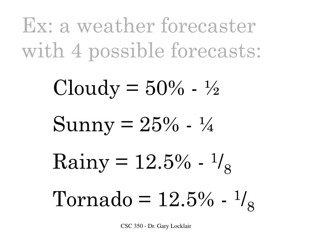 Ex: a weather forecaster with 4 possible forecasts: Cloudy = 50% - ½ Sunny = 25% - ¼ Rainy = 12.5% - 1/8 Tornado = 12.5% - 1/8 CSC 350 - Dr. Gary Locklair