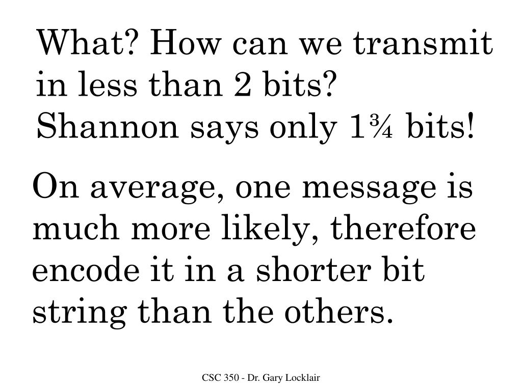 What? How can we transmit in less than 2 bits?Shannon says only 1¾ bits! On average, one message is much more likely, therefore encode it in a shorter bit string than the others. CSC 350 - Dr. Gary Locklair