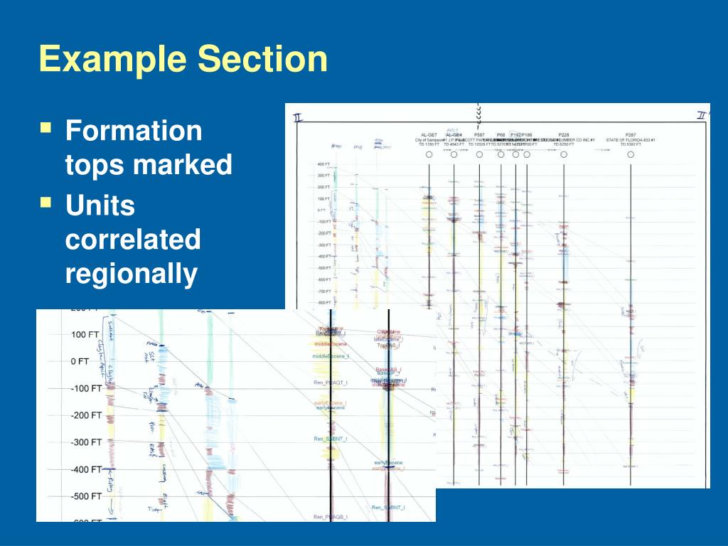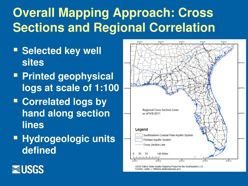 Overall Mapping Approach: Cross Sections and Regional Correlation • Selected key well sites • Printed geophysical logs at scale of 1:100 • Correlated logs by hand along section lines • Hydrogeologic units defined