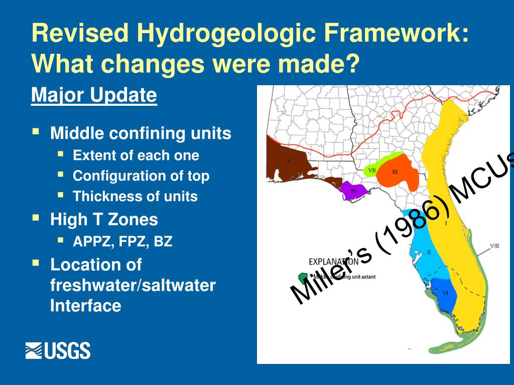 Revised Hydrogeologic Framework: What changes were made? Major Update • Middle confining units • Extent of each one • Configuration of top • Thickness of units • High T Zones • APPZ, FPZ, BZ • Location of freshwater/saltwater Interface Miller’s (1986) MCUs
