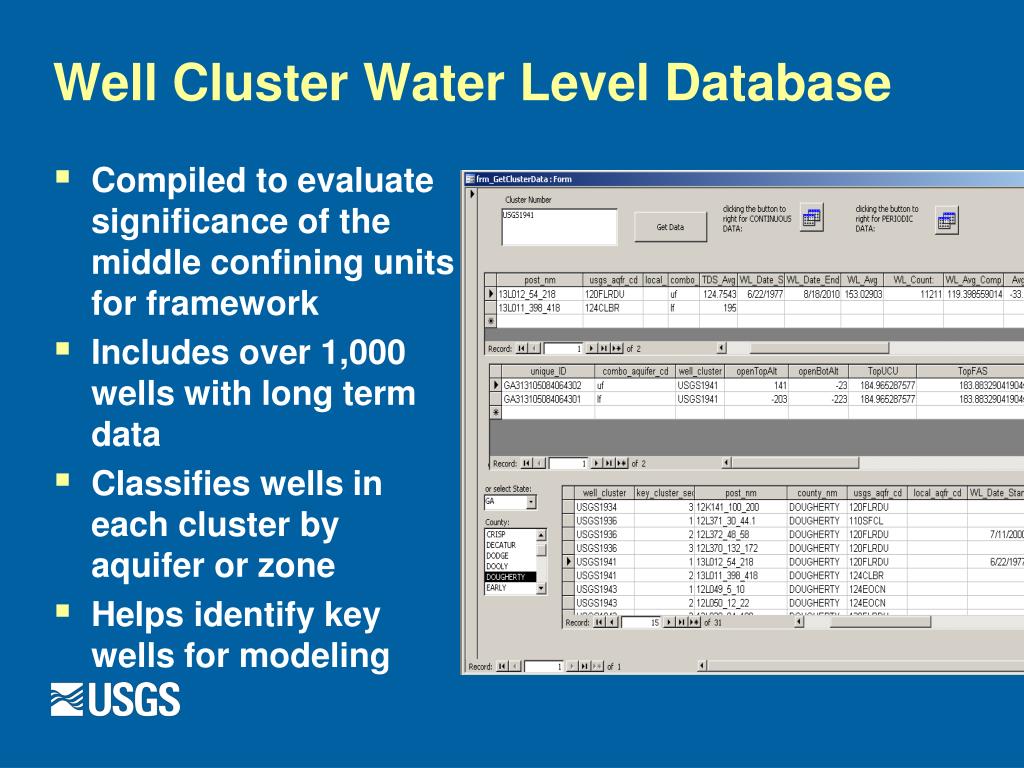 Well Cluster Water Level Database • Compiled to evaluate significance of the middle confining units for framework • Includes over 1,000 wells with long term data • Classifies wells in each cluster by aquifer or zone • Helps identify key wells for modeling