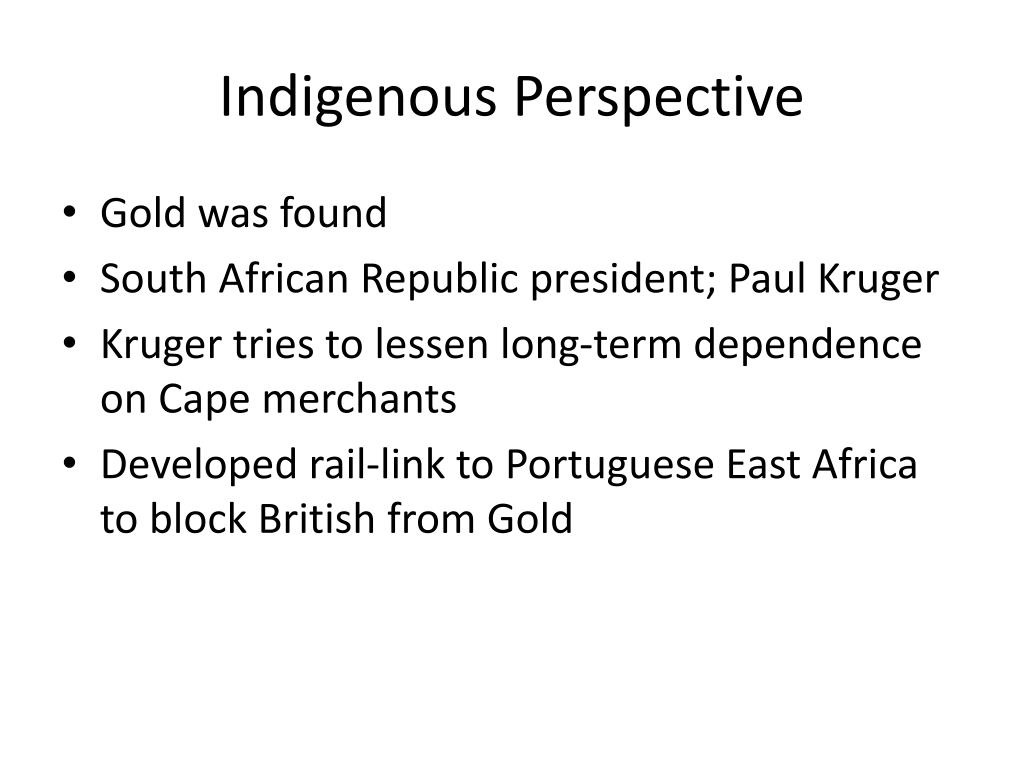 Indigenous Perspective • Gold was found • South African Republic president; Paul Kruger • Kruger tries to lessen long-term dependence on Cape merchants • Developed rail-link to Portuguese East Africa to block British from Gold