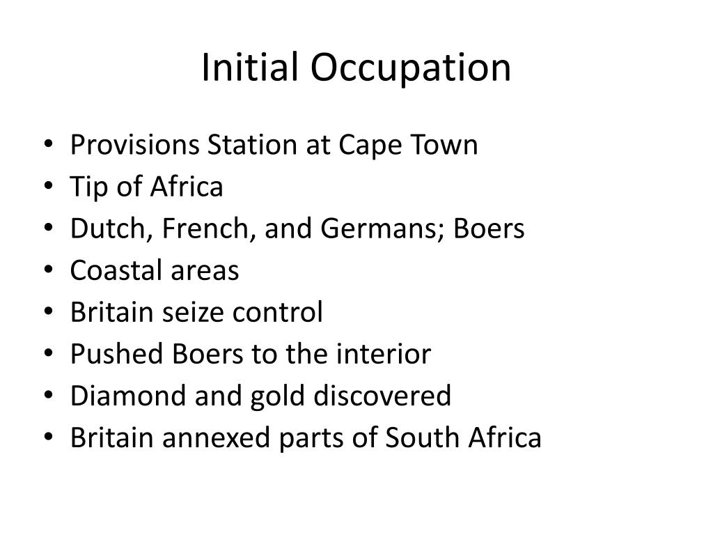 Initial Occupation • Provisions Station at Cape Town • Tip of Africa • Dutch, French, and Germans; Boers • Coastal areas • Britain seize control • Pushed Boers to the interior • Diamond and gold discovered • Britain annexed parts of South Africa