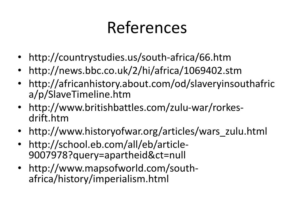 References • http://countrystudies.us/south-africa/66.htm • http://news.bbc.co.uk/2/hi/africa/1069402.stm • http://africanhistory.about.com/od/slaveryinsouthafrica/p/SlaveTimeline.htm • http://www.britishbattles.com/zulu-war/rorkes-drift.htm • http://www.historyofwar.org/articles/wars_zulu.html • http://school.eb.com/all/eb/article-9007978?query=apartheid&ct=null • http://www.mapsofworld.com/south-africa/history/imperialism.html