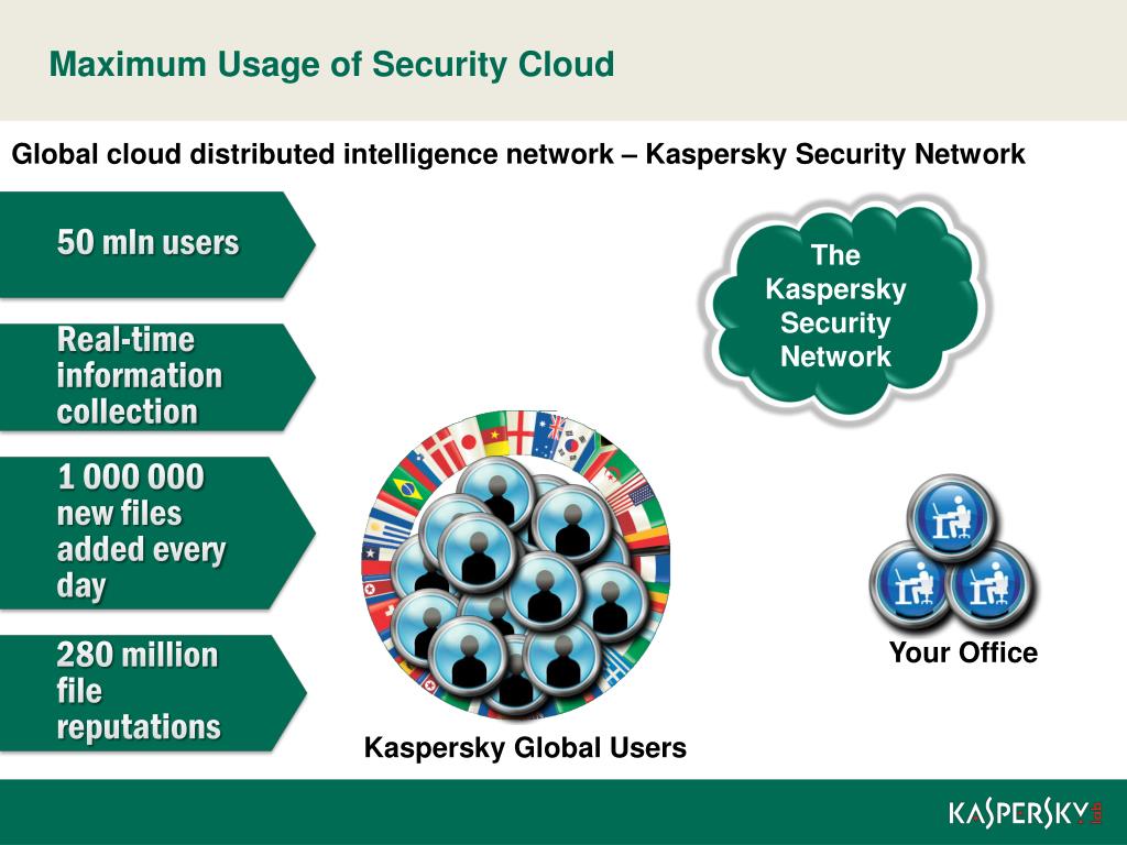 Maximum Usage of Security Cloud Global cloud distributed intelligence network – Kaspersky Security Network • 50 mln users The Kaspersky Security Network • Real-time information collection Kaspersky Global Users • 1 000 000new files added every day Your Office • 280 million file reputations Kaspersky Global Users