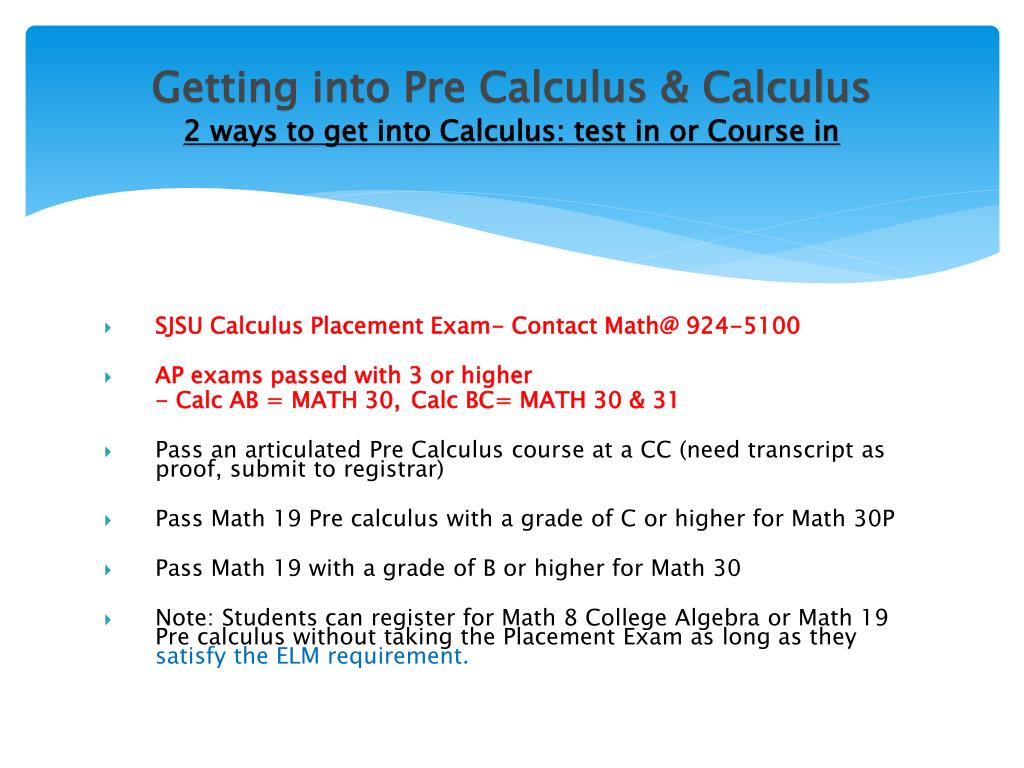 Getting into Pre Calculus & Calculus2 ways to get into Calculus: test in or Course in • SJSU Calculus Placement Exam-Contact Math@ 924-5100 • AP exams passed with 3 or higher - Calc AB = MATH 30, Calc BC= MATH 30 & 31 • Pass an articulated Pre Calculus course at a CC (need transcript as proof, submit to registrar) • Pass Math 19 Pre calculus with a grade of C or higher for Math 30P • Pass Math 19 with a grade of B or higher for Math 30 • Note: Students can register for Math 8 College Algebra or Math 19 Pre calculus without taking the Placement Exam as long as they satisfy the ELM requirement.