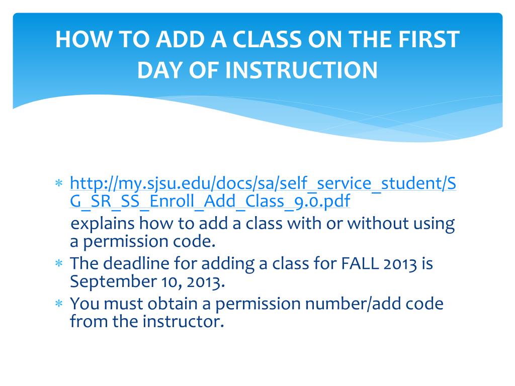 HOW TO ADD A CLASS ON THE FIRST DAY OF INSTRUCTION http://my.sjsu.edu/docs/sa/self_service_student/SG_SR_SS_Enroll_Add_Class_9.0.pdf explains how to add a class with or without using a permission code. The deadline for adding a class for FALL 2013 is September 10, 2013. You must obtain a permission number/add code from the instructor.