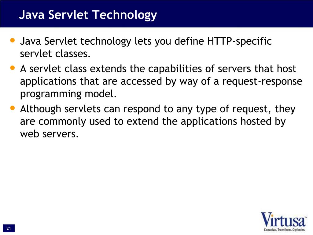 Java Servlet Technology • Java Servlet technology lets you define HTTP-specific servlet classes. • A servlet class extends the capabilities of servers that host applications that are accessed by way of a request-response programming model. • Although servlets can respond to any type of request, they are commonly used to extend the applications hosted by web servers.