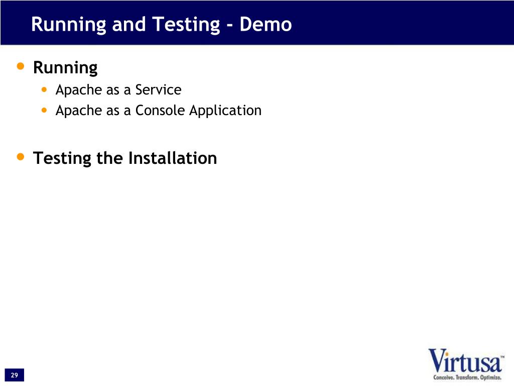 Running and Testing - Demo • Running • Apache as a Service • Apache as a Console Application • Testing the Installation
