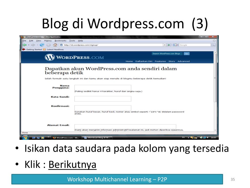 Blog di Wordpress.com (3) Isikan data saudara pada kolom yang tersedia Klik : Berikutnya