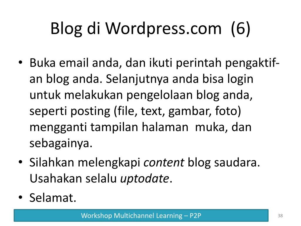 Blog di Wordpress.com (6) Buka email anda, dan ikuti perintah pengaktif-an blog anda. Selanjutnya anda bisa login untuk melakukan pengelolaan blog anda, seperti posting (file, text, gambar, foto) mengganti tampilan halaman muka, dan sebagainya. Silahkan melengkapi content blog saudara. Usahakan selalu uptodate. Selamat.