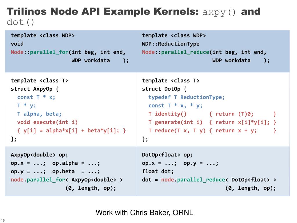 Trilinos Node API Example Kernels: axpy() and dot() Work with Chris Baker, ORNL