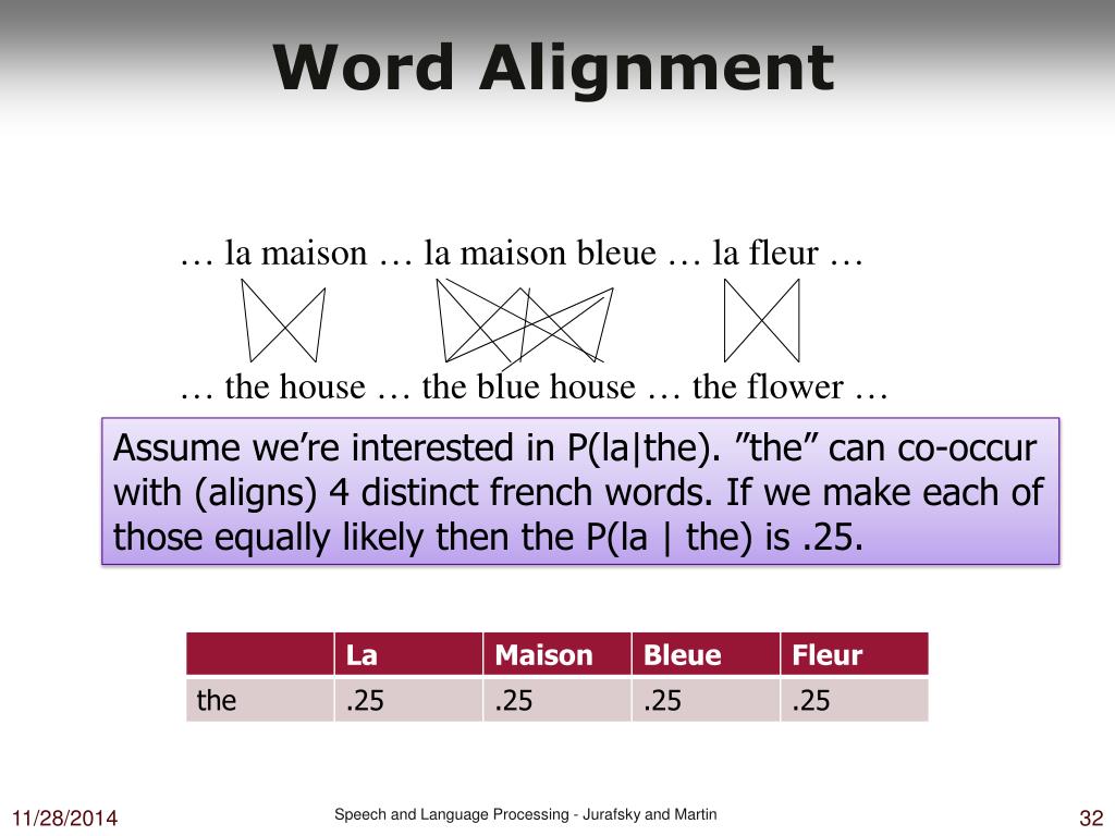 Word Alignment … la maison … la maison bleue … la fleur … … the house … the blue house … the flower … But “la” and “the” are observed to co-occur more frequently than expected so P(la | the) should increase. Meaning the others P(x |the) need to decrease (to still sum to 1). Speech and Language Processing - Jurafsky and Martin