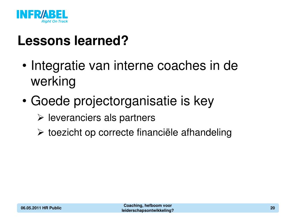 Lessons learned? • Integratie van interne coaches in de werking • Goede projectorganisatie is key • leveranciers als partners • toezicht op correcte financiële afhandeling Coaching, hefboom voor leiderschapsontwikkeling?