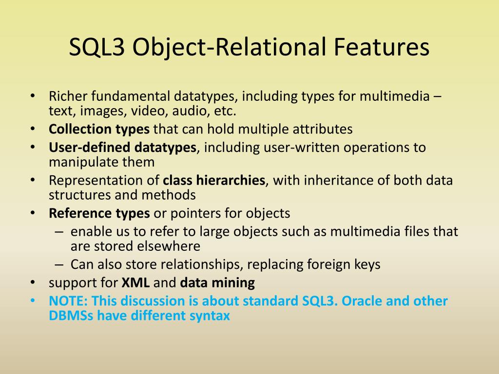 SQL3 Object-Relational Features • Richer fundamental datatypes, including types for multimedia – text, images, video, audio, etc. • Collection types that can hold multiple attributes • User-defined datatypes, including user-written operations to manipulate them • Representation of class hierarchies, with inheritance of both data structures and methods • Reference types or pointers for objects • enable us to refer to large objects such as multimedia files that are stored elsewhere • Can also store relationships, replacing foreign keys • support for XML and data mining • NOTE: This discussion is about standard SQL3. Oracle and other DBMSs have different syntax