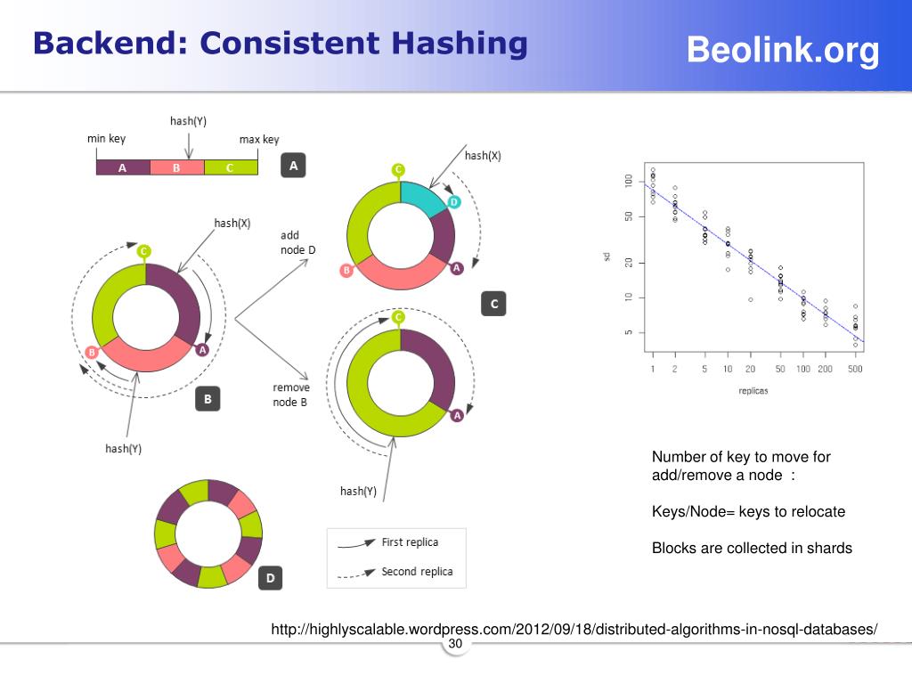 Backend: ConsistentHashing Number of key to move for add/remove a node : Keys/Node= keys to relocate Blocks are collected in shards http://highlyscalable.wordpress.com/2012/09/18/distributed-algorithms-in-nosql-databases/
