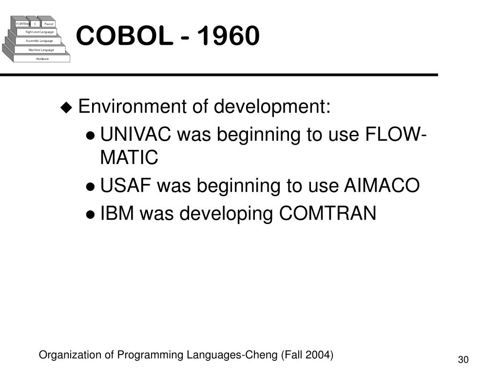 COBOL - 1960 • Environment of development: • UNIVAC was beginning to use FLOW-MATIC • USAF was beginning to use AIMACO • IBM was developing COMTRAN