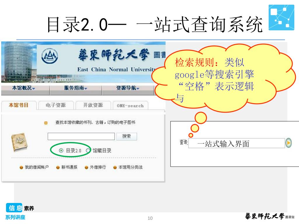 目录2.0— 一站式查询系统 检索规则:类似google等搜索引擎 “空格”表示逻辑与 一站式输入界面