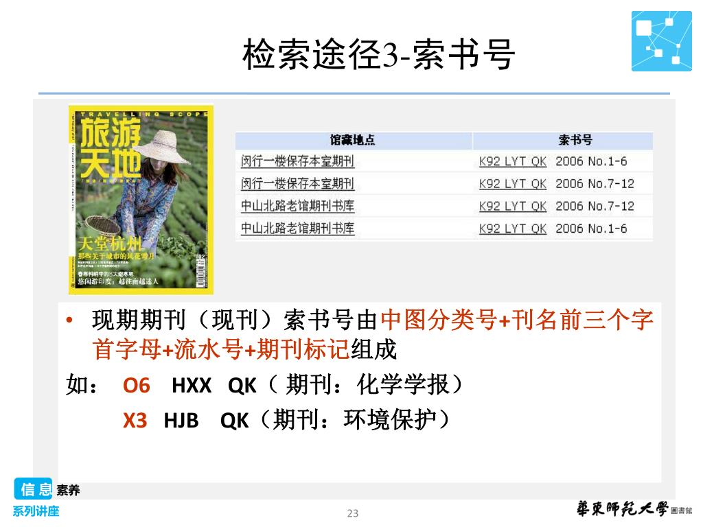 检索途径3-索书号 • 现期期刊(现刊)索书号由中图分类号+刊名前三个字首字母+流水号+期刊标记组成 如: O6 HXX QK( 期刊:化学学报) X3 HJB QK(期刊:环境保护)