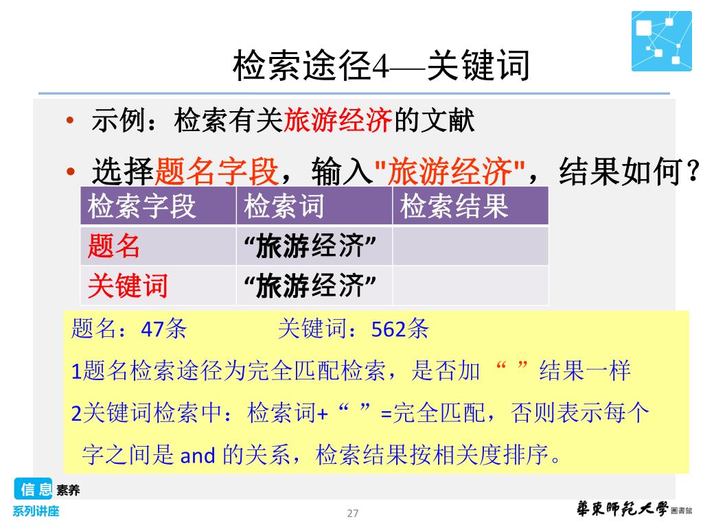 检索途径4—关键词 • 示例:检索有关旅游经济的文献 • 选择题名字段,输入"旅游经济",结果如何? 题名:47条关键词:562条 1题名检索途径为完全匹配检索,是否加“ ”结果一样 2关键词检索中:检索词+“ ”=完全匹配,否则表示每个 字之间是 and 的关系,检索结果按相关度排序。