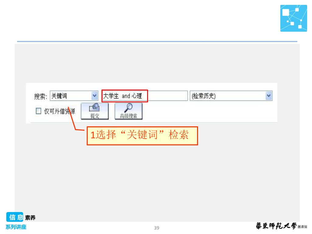 图书馆网站:http://www.lib.ecnu.edu.cn/ 1:输入检索词 快速检索入口 3:点击进行检索 2:选择检索平台