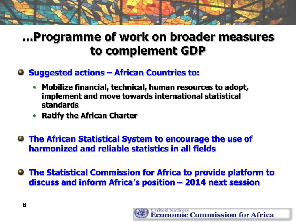 …Programme of work on broader measures to complement GDP • Suggested actions – AUC, ECA, AfDB and others • Provide required support Africa’s participation in the global process - meeting early 2013 • Technical assistance and policy advice • Help create and maintain strong linkages between national and global processes