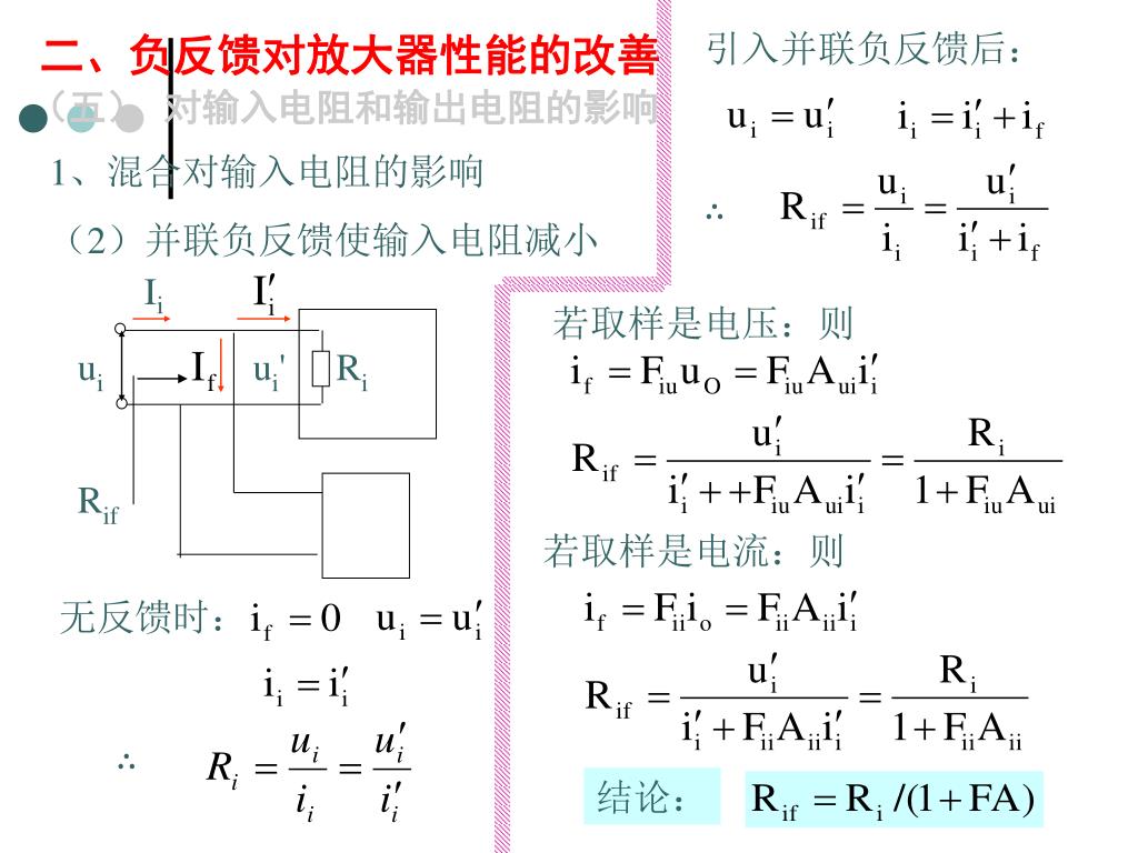 Ii ui ui' Ri Rif 二、负反馈对放大器性能的改善 引入并联负反馈后: (五) 对输入电阻和输出电阻的影响 1、混合对输入电阻的影响 (2)并联负反馈使输入电阻减小 ∴ 若取样是电压:则 若取样是电流:则 无反馈时: ∴ 结论: