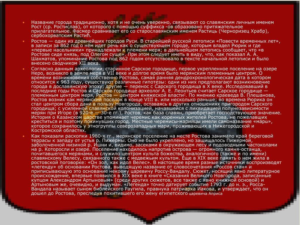 Название города традиционно, хотя и не очень уверенно, связывают со славянским личным именем Рост (ср. Ростислав), от которого с помощью суффикса -ов образовано притяжательное прилагательное. Фасмер сравнивает его со старославянским именем Растиць (Черноризец Храбр), сербохорватским Растиħ. • Ростов — один из древнейших городов Руси. В старейшей русской летописи «Повести временных лет», в записи за 862 год о нём идет речь как о существующем городе, которым владел Рюрик и где «первые насельники» принадлежали к племени меря; в дальнейшем летопись сообщает, что «в Ростове сиде князь, под Олегом суще». При этом следует иметь в виду, что, как показал А. А. Шахматов, упоминание Ростова под 862 годом отсутствовало в тексте начальной летописи и было внесено сводчиком XII века. • Согласно данным археологии, старинное Сарское городище, первое укрепленное поселение на озере Неро, возникло в земле меря в VII веке и долгое время было мерянским племенным центром. О времени возникновения собственно Ростова, самая ранняя дендрохронологическая дата в котором относится к 963 году, существуют различные гипотезы: одни из них предполагают возникновение города в дославянскую эпоху, другие — перенос с Сарского городища в X веке. Исследовавший в последние годы Ростов и Сарское городище археолог А. Е. Леонтьев считает Сарское городище — племенным центром меря, Ростов — центром княжеской власти]. По мнению краеведа В. Плешанова, Ростов возник как мерянский поселок в конце VIII в. или несколько раньше; во времена Рюрика он стал центром сбора дани в пользу Новгорода, оставаясь в других отношениях пригородом Сарского городища; с усиленной славянской колонизацией, начавшейся с ликвидацией полунезависимости мерян при Игоре (в 920-е — 30-е гг.), Ростов, как база славян, приобретает господствующее значение. История о Казанском царствеупоминает черемис как коренных жителей Ростова, не пожелавших креститься и поэтому покинувших город. Местные черемисы-марийцы имели самоназвание «мäpӹ», которое сохранилось у этногруппысеверозападных мари, проживающих в Нижегородской и Костромской областях. • Как показали раскопки 1980-х гг., мерянское поселение на месте Ростова занимало край береговой террасы к западу от устья р. Пижермы. Оно не было укреплено, но защищалось Пижермой, заболоченной низиной р. Ишни и, видимо, засеками в окружающем лесу и подоводными частоколами на р. Которосли и озере. Поселение находилось напротив острова — огромного камня-останца, почитавшегося мерянами, и служило центром культа божества, аналогичного (также и по имени) славянскому Велесу, связанного также с медвежьим культом. Еще в XIX веке память о нем жила в ростовской поговорке: «Он зол, как идол Велес». В настоящее время разные источники воспроизводят «легенду» об основании Ростова, выводящую название от словосочетания «Россов стан» и приписывающую это основание некоему царевичу Россу-Вандалу. Сюжет, носящий явно литературное происхождение, впервые появился в XIX веке в книге «Сказания Великого Новгорода, записанные купцом Александром Артыновым» (среди других сюжетов, все также с явно книжной основой) и Артыновым же, очевидно, и выдуман. «Легенда» точно датирует событие 1793 г. до н. э., Росса-Вандала называет сыном библейского Раугила, правнука патриарха Иакова, и утверждает, что он дошел до Ростова, 