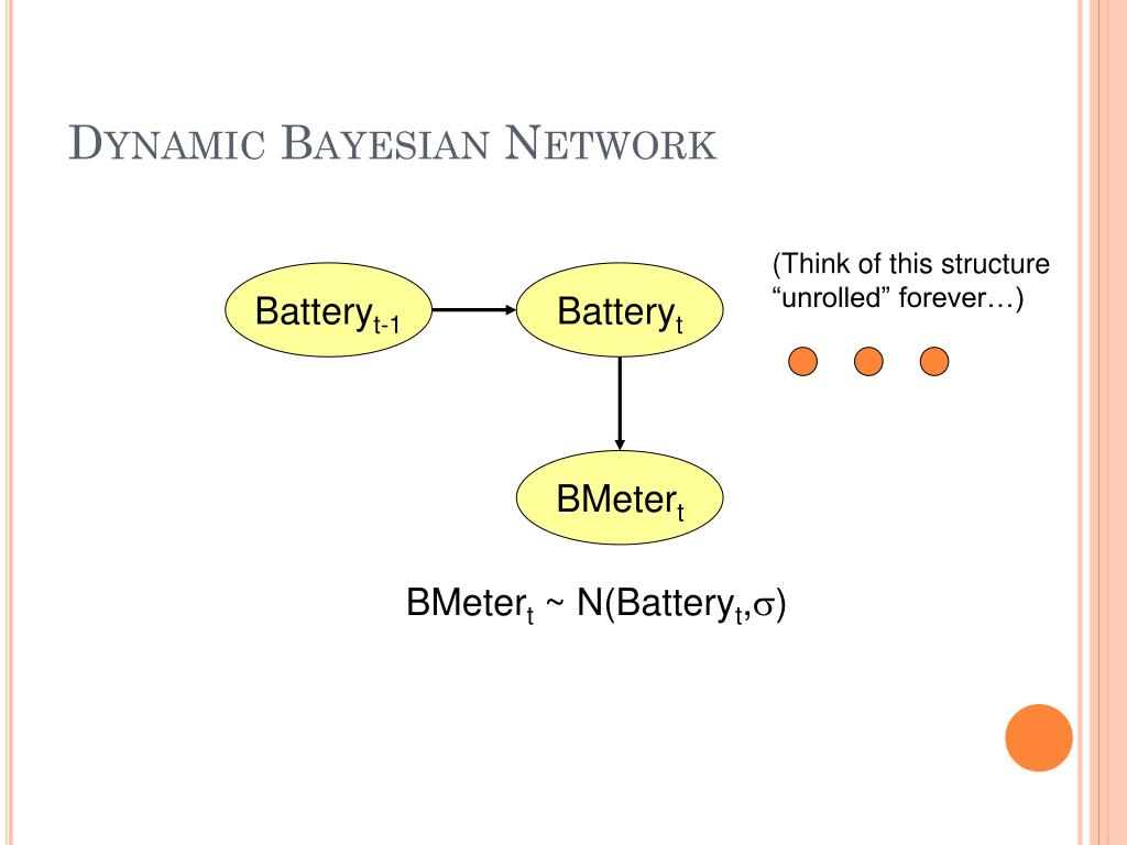 Dynamic Bayesian Network (Think of this structure “unrolled” forever…) Batteryt-1 Batteryt BMetert BMetert ~ N(Batteryt,s)