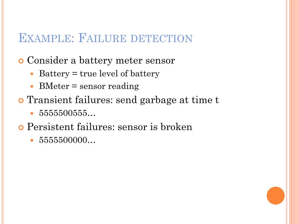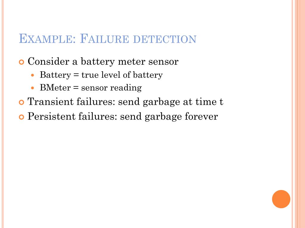 Example: Failure detection • Consider a battery meter sensor • Battery = true level of battery • BMeter = sensor reading • Transient failures: send garbage at time t • Persistent failures: send garbage forever