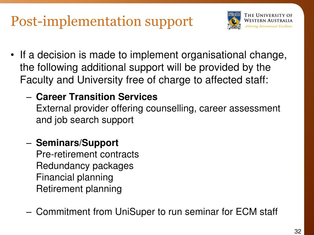 Post-implementation support • If a decision is made to implement organisational change, the following additional support will be provided by the Faculty and University free of charge to affected staff: • Career Transition ServicesExternal provider offering counselling, career assessment and job search support • Seminars/Support Pre-retirement contracts Redundancy packages Financial planning Retirement planning • Commitment from UniSuper to run seminar for ECM staff