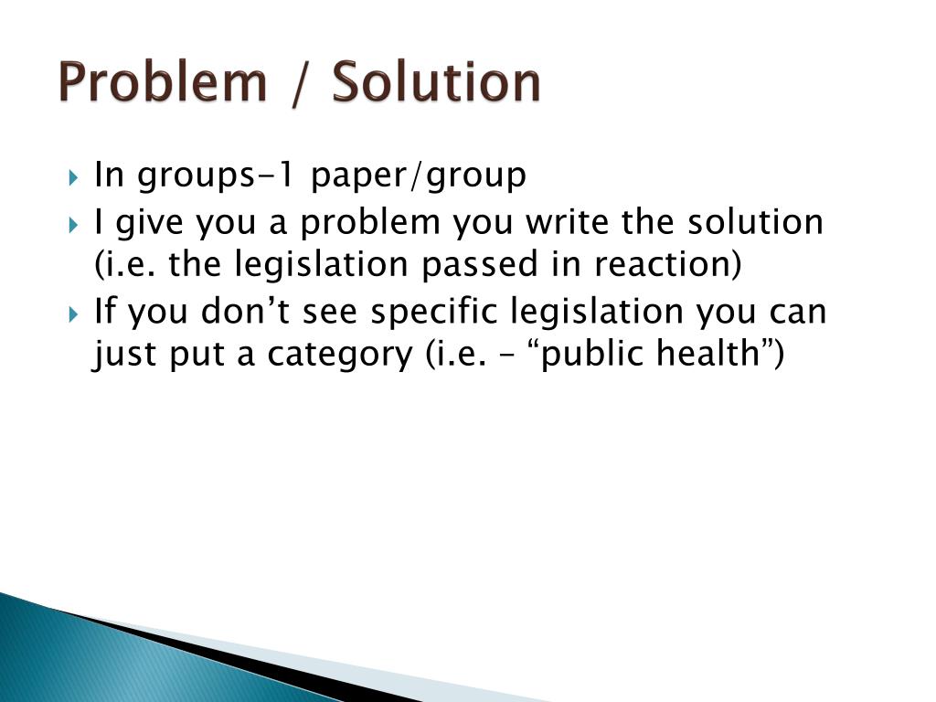 Problem / Solution • In groups-1 paper/group • I give you a problem you write the solution (i.e. the legislation passed in reaction) • If you don’t see specific legislation you can just put a category (i.e. – “public health”)