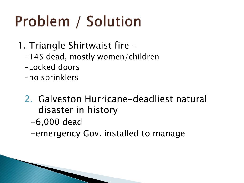 Problem / Solution 1. Triangle Shirtwaist fire – -145 dead, mostly women/children -Locked doors -no sprinklers • Galveston Hurricane-deadliest natural disaster in history -6,000 dead -emergency Gov. installed to manage