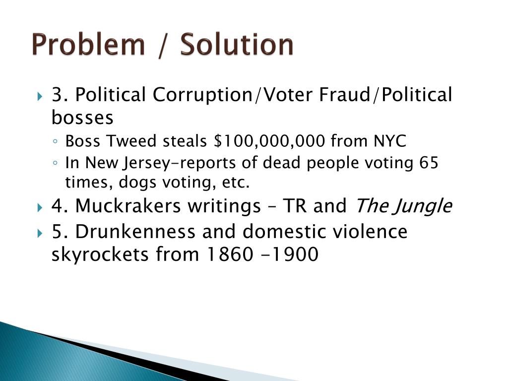 Problem / Solution • 3. Political Corruption/Voter Fraud/Political bosses • Boss Tweed steals $100,000,000 from NYC • In New Jersey-reports of dead people voting 65 times, dogs voting, etc. • 4. Muckrakers writings – TR and The Jungle • 5. Drunkenness and domestic violence skyrockets from 1860 -1900