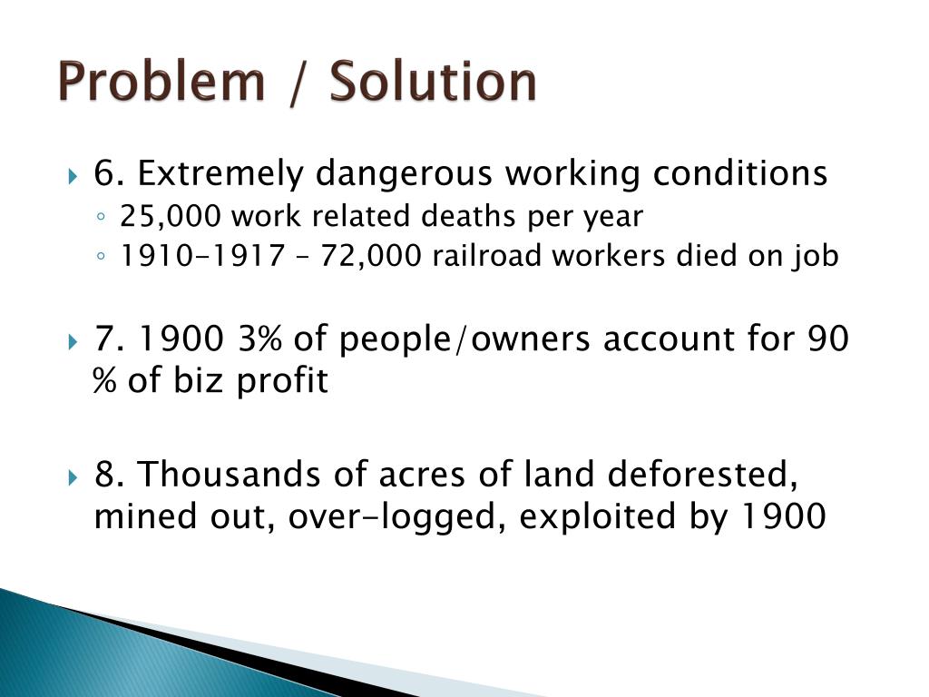Problem / Solution • 6. Extremely dangerous working conditions • 25,000 work related deaths per year • 1910-1917 – 72,000 railroad workers died on job • 7. 1900 3% of people/owners account for 90 % of biz profit • 8. Thousands of acres of land deforested, mined out, over-logged, exploited by 1900