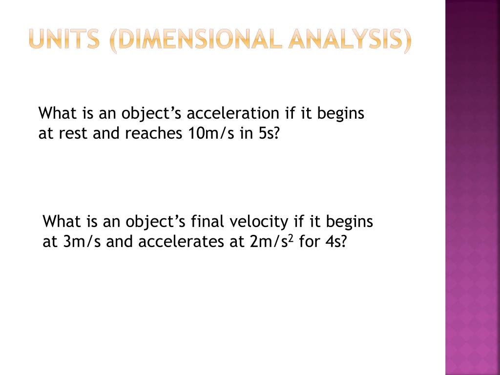 Units (dimensional analysis) What is an object’s acceleration if it begins at rest and reaches 10m/s in 5s? What is an object’s final velocity if it begins at 3m/s and accelerates at 2m/s2 for 4s?